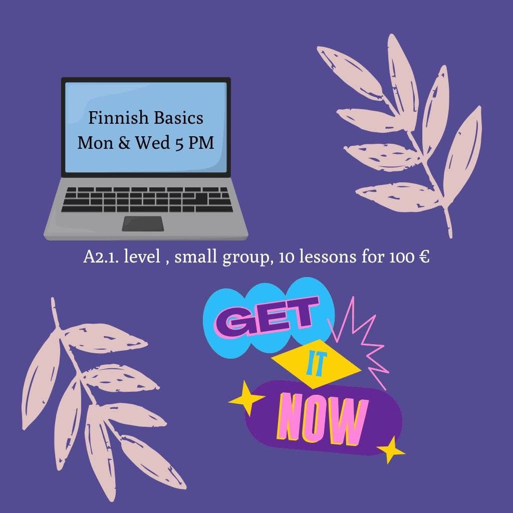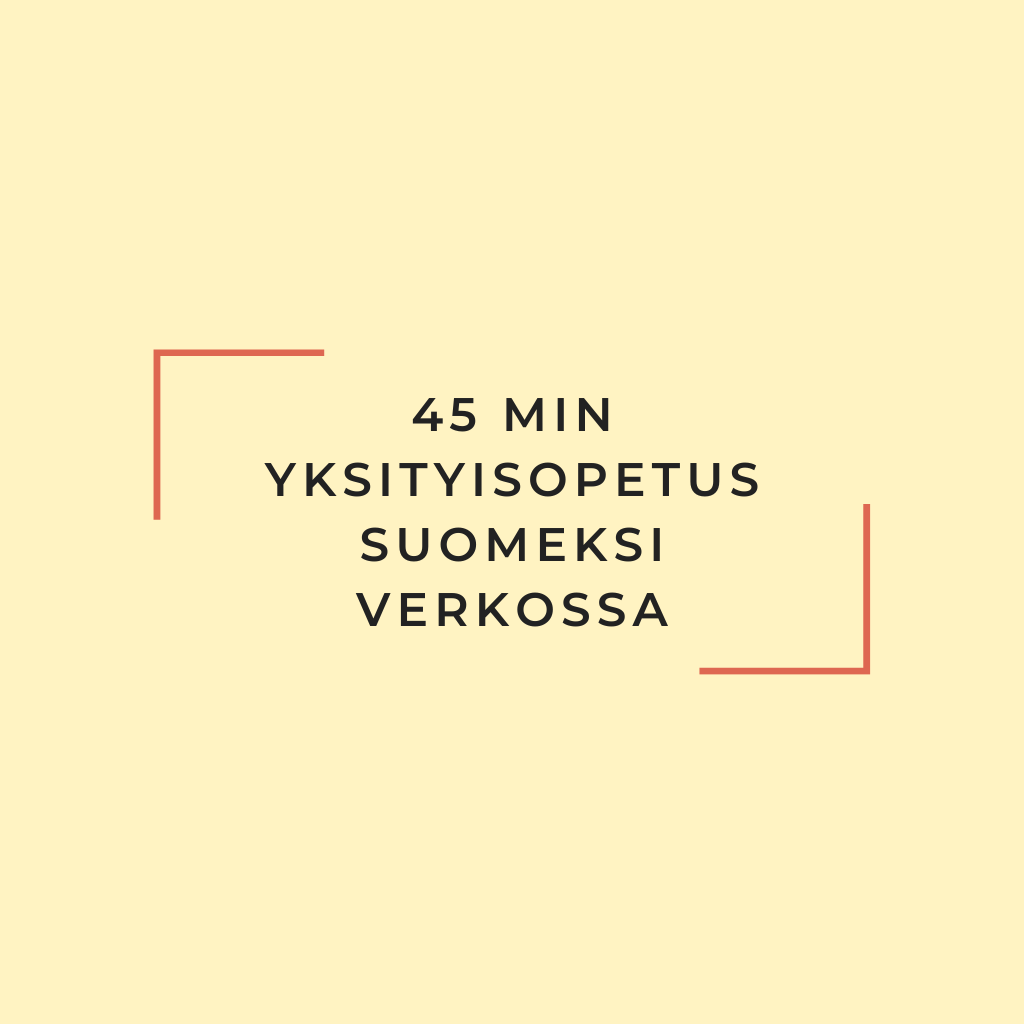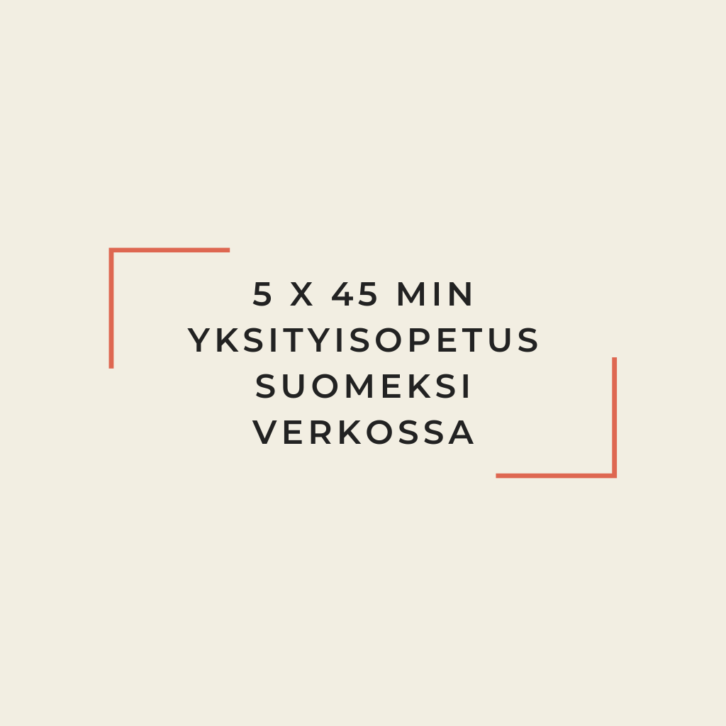 Tervetuloa oppimaan yksityisesti suomea verkossa! Pakettiin sisältyy viisi 45 minuutin oppituntia, jolloin saat henkilökohtaista ohjausta oppimisen tueksi. Joustavat ja tehokkaat oppitunnit suunnitellaan vastaamaan tavoitteitasi.